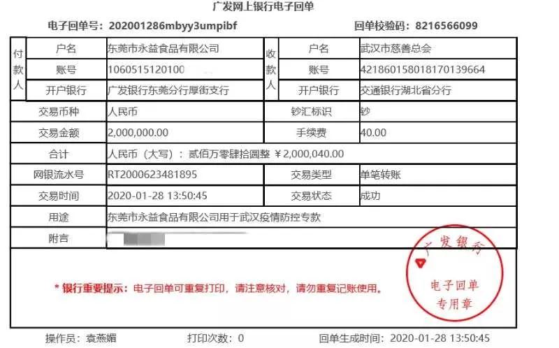 記者28日從東莞市永益食品有限公司獲悉,該公司當日向武漢市慈善總會捐贈200萬元,用于武漢疫情防控醫(yī)療專用款項。