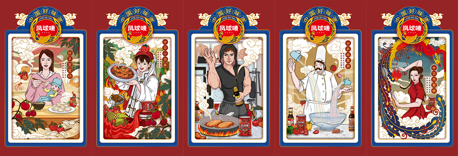 活力滿滿的紅色被金黃色包圍,即展現(xiàn)了鳳球嘜主打產(chǎn)品番茄醬優(yōu)質(zhì)的色澤和產(chǎn)品屬性,又傳達(dá)出了中國傳統(tǒng)民族文化吉祥喜慶的寓意。寓意吉祥的鳳凰采用金黃色和紫色搭配,指向了中華傳統(tǒng)文化祥瑞之物鳳凰的闡釋:“多黃者鵷雛,多紫者鸑鷟”,也賦予了順天道、尚人文、致太平、向光亮的象征。