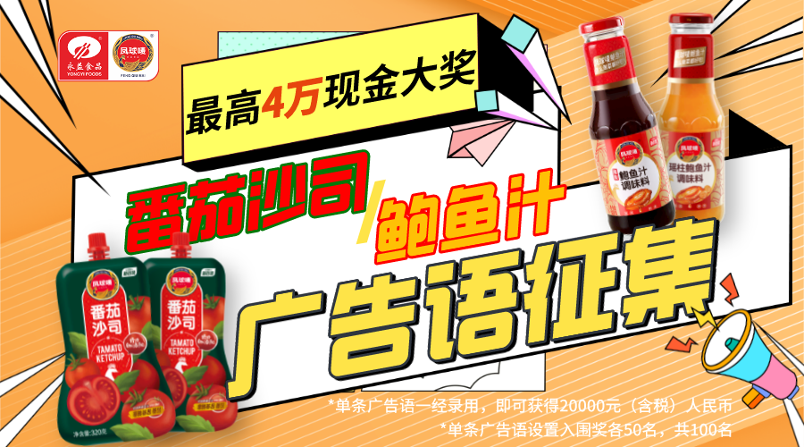 面向全國范圍內公平有獎征集,應征主體不限,所有熟悉使用鳳球嘜番茄沙司與鮑魚汁產品的廣大廚師、消費者、專業廣告公司等創意組織、團隊與個人,均可參加本次征集活動。
